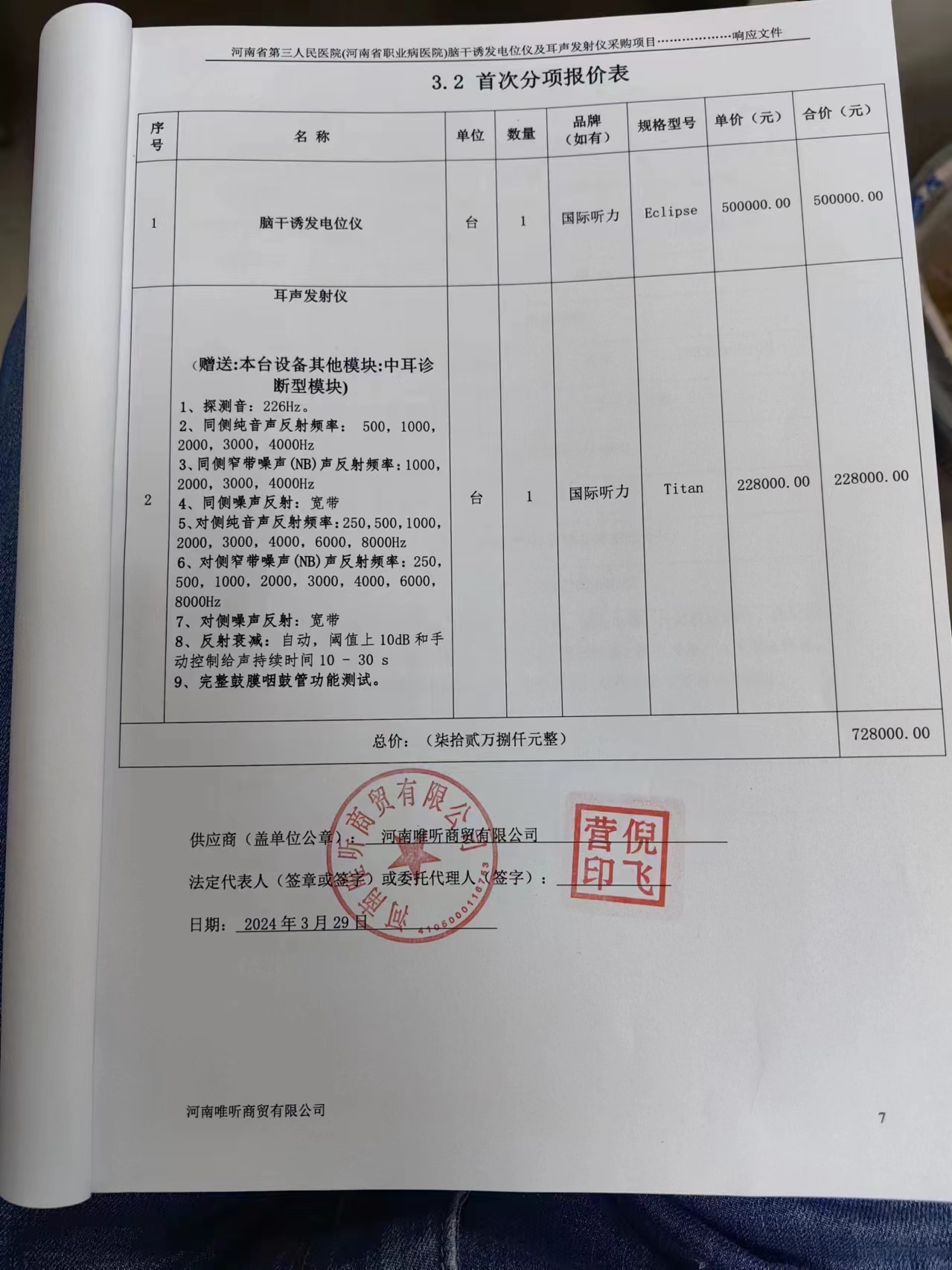 河南省第三人民醫(yī)院(河南省職業(yè)病醫(yī)院)腦干誘發(fā)電位儀及耳聲發(fā)射儀采購項目 | 河南唯聽商貿(mào)有限公司 | 安陽市北關區(qū)解放路鴻泰公寓1幢大樓中間辦公樓一樓大門東側 | 723000.00 | 金額 | 元 | ||||
