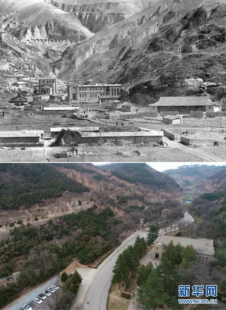 這是一張拼版照片,上圖為:1943年拍攝的延安楊家?guī)X——抗日戰(zhàn)爭(zhēng)時(shí)期黨中央所在地(吳印咸攝);下圖為:2021年4月21日拍攝的延安楊家?guī)X革命舊址(無(wú)人機(jī)照片,新華社記者張博文攝)。新華社發(fā)