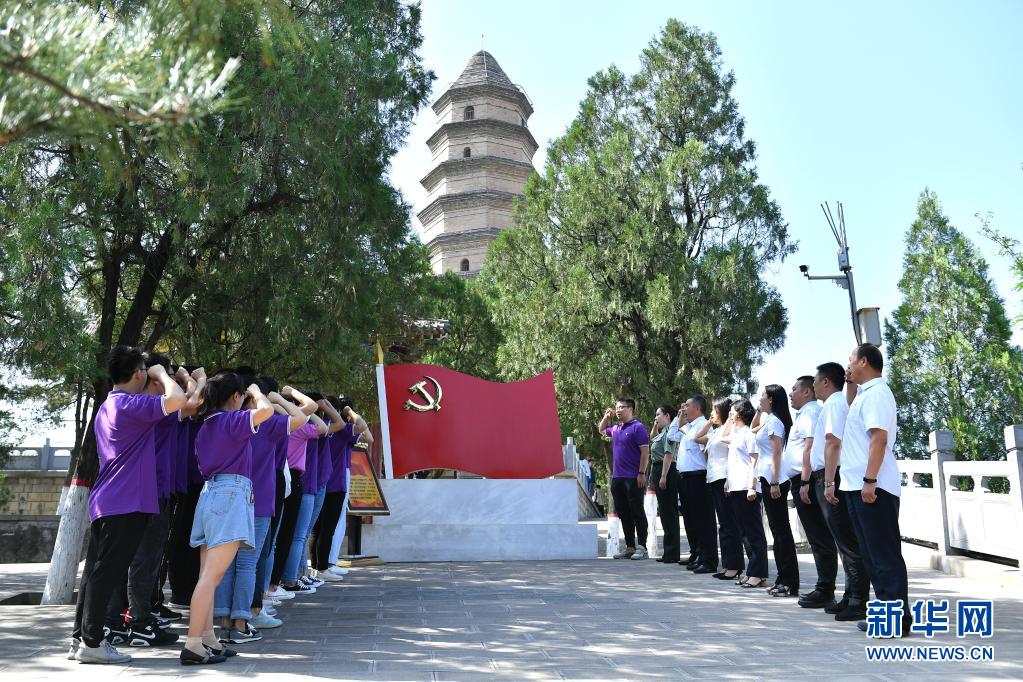 2020年6月29日,黨員干部在延安市寶塔山重溫入黨誓詞。新華社記者 張博文 攝