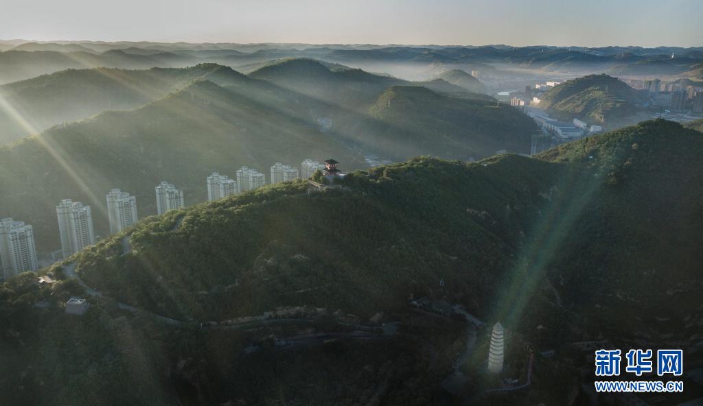 這是2019年8月29日拍攝的被綠色環(huán)繞的陜西省延安市寶塔山(無(wú)人機(jī)照片)。新華社記者 陶明 攝