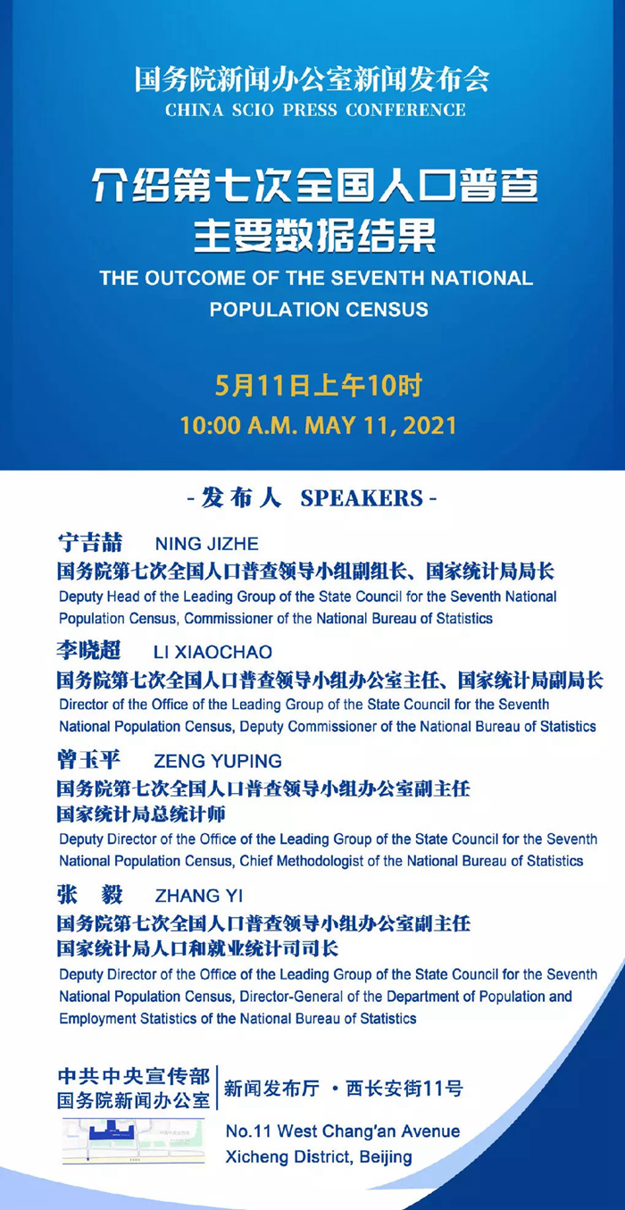 國(guó)務(wù)院新聞辦公室定于2021年5月11日上午10時(shí)舉行新聞發(fā)布會(huì),請(qǐng)國(guó)務(wù)院第七次全國(guó)人口普查領(lǐng)導(dǎo)小組副組長(zhǎng)、國(guó)家統(tǒng)計(jì)局局長(zhǎng)寧吉喆,國(guó)務(wù)院第七次全國(guó)人口普查領(lǐng)導(dǎo)小組辦公室主任、國(guó)家統(tǒng)計(jì)局副局長(zhǎng)李曉超,國(guó)務(wù)院第七次全國(guó)人口普查領(lǐng)導(dǎo)小組辦公室副主任、國(guó)家統(tǒng)計(jì)局總統(tǒng)計(jì)師曾玉平,國(guó)務(wù)院第七次全國(guó)人口普查領(lǐng)導(dǎo)小組辦公室副主任、國(guó)家統(tǒng)計(jì)局人口和就業(yè)統(tǒng)計(jì)司司長(zhǎng)張毅介紹第七次全國(guó)人口普查主要數(shù)據(jù)結(jié)果,并答記者問。