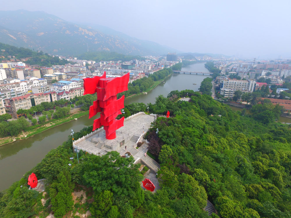 △河南省信陽市新縣鄂豫皖蘇區(qū)首府革命博物館附近的英雄山八面紅旗雕塑(2017年8月4日攝)。新華社記者 馮大鵬 攝