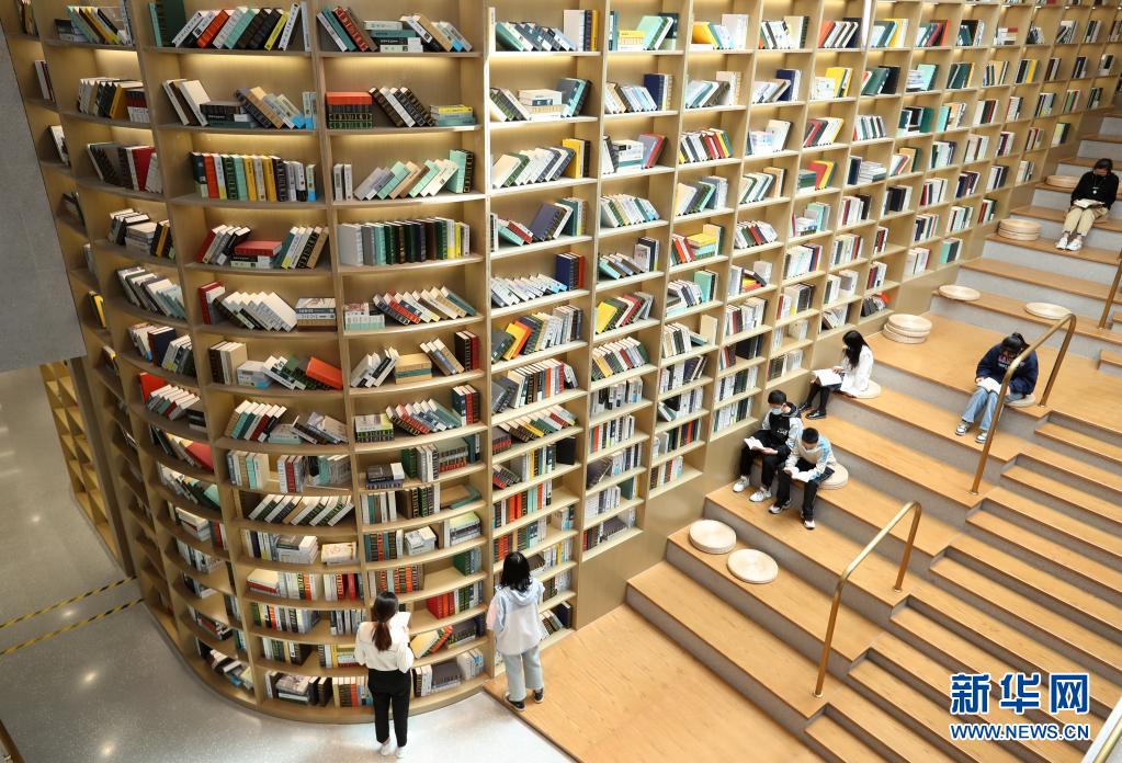 2021年5月2日,讀者在安徽省蒙城縣圖書館天梯書架旁閱讀書籍。新華社發(fā)(胡衛(wèi)國 攝)