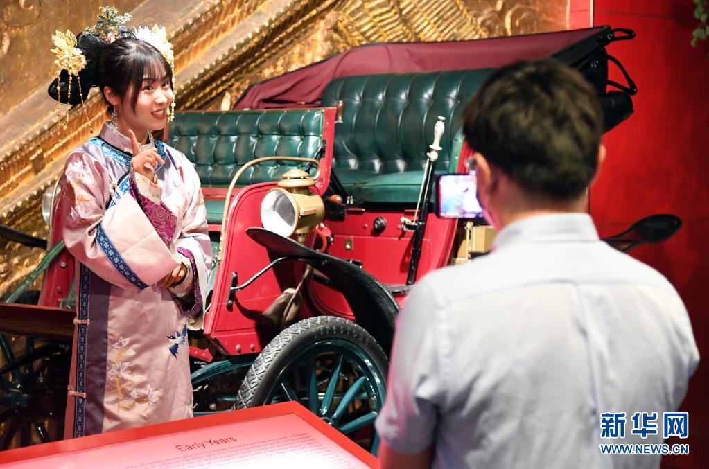2020年5月18日,在北京汽車博物館,曾紅娟(左)用講故事的方式通過網(wǎng)絡(luò)直播平臺為觀眾介紹藏品車。新華社記者 任超 攝