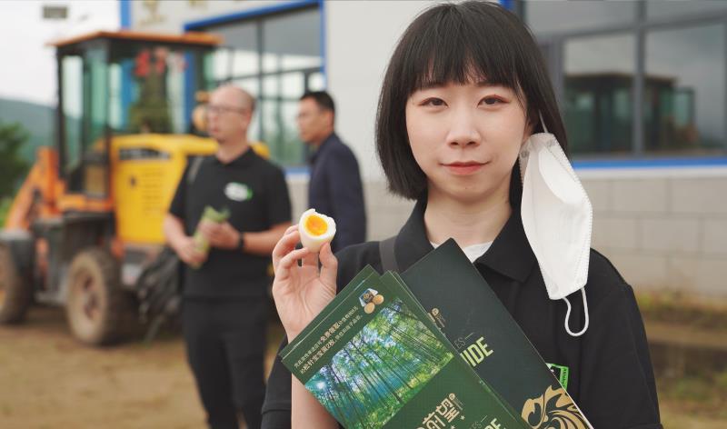 2020年8月,阿里鄉(xiāng)村品牌設(shè)計(jì)師蔣宇寧在吉林省汪清縣走訪調(diào)研松針雞養(yǎng)殖基地,手中拿著當(dāng)?shù)氐乃舍橂u蛋。(受訪者供圖)