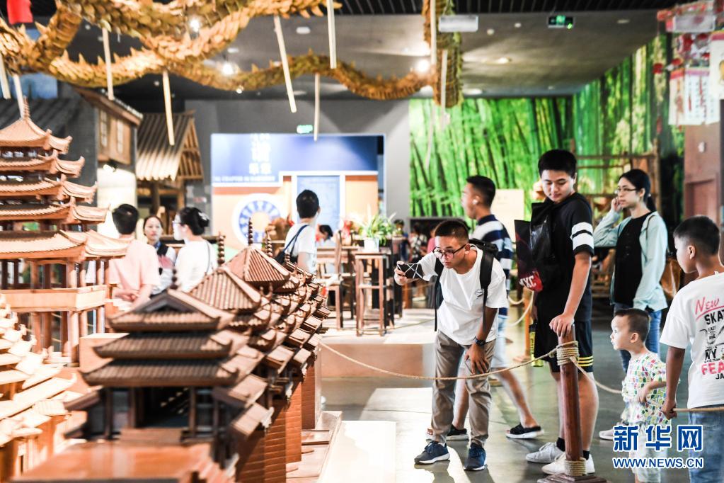 參觀(guān)者在廣西民族博物館里參觀(guān)風(fēng)雨橋模型(2019年10月4日攝)。新華社記者 曹祎銘 攝