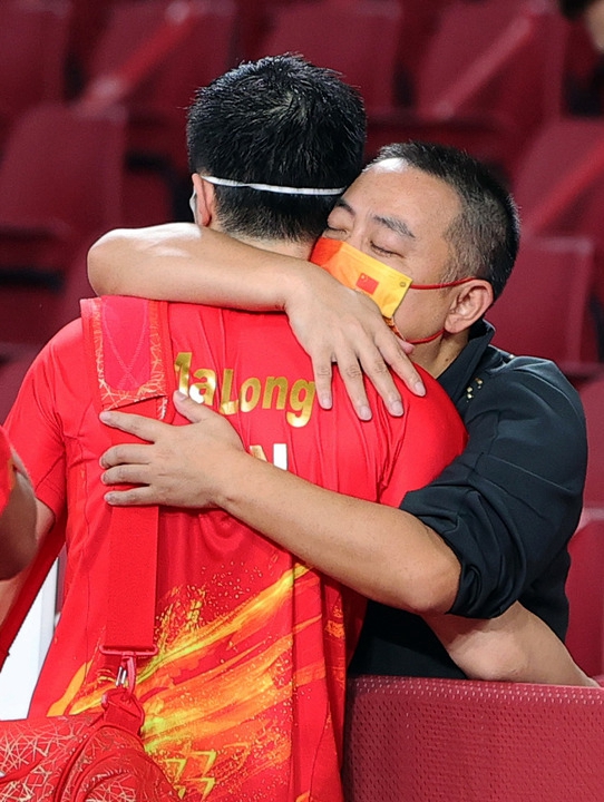 7月29日,劉國(guó)梁(右)和馬龍慶祝勝利。當(dāng)日,在東京奧運(yùn)會(huì)乒乓球項(xiàng)目男子單打半決賽中,中國(guó)選手馬龍以4比3戰(zhàn)勝德國(guó)選手奧恰洛夫,晉級(jí)決賽。新華社記者 王東震 攝