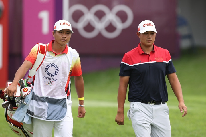 7月29日,中國(guó)選手袁也淳(右)在比賽中。當(dāng)天,東京奧運(yùn)會(huì)高爾夫項(xiàng)目男子個(gè)人比桿賽在日本埼玉縣霞關(guān)鄉(xiāng)村俱樂(lè)部開賽。新華社記者 鄭煥松 攝