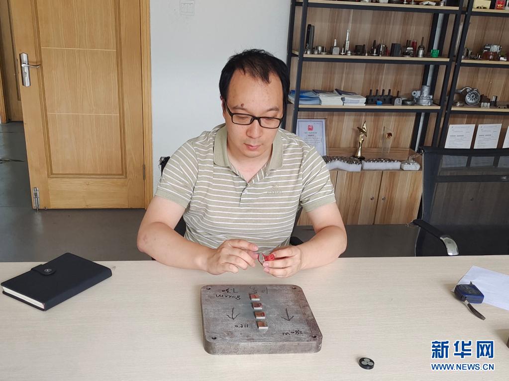 8月2日,在浙江省寧波市北侖區(qū)寧波經(jīng)濟(jì)技術(shù)開發(fā)區(qū)科技創(chuàng)業(yè)園,匠心快速成型技術(shù)有限公司總經(jīng)理錢濱在查看樣品質(zhì)量。新華社發(fā)