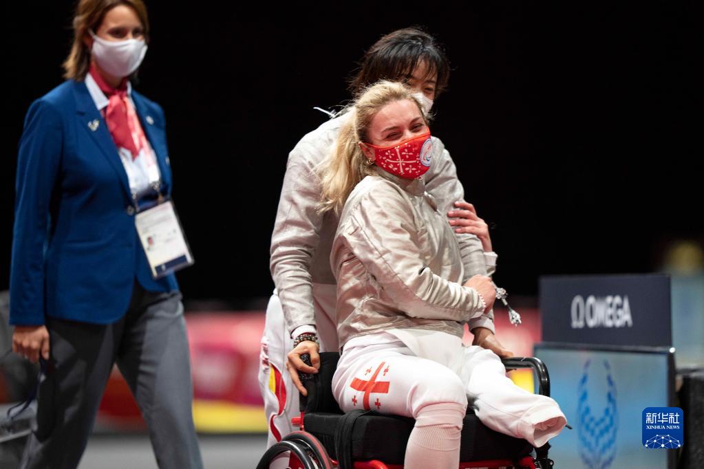 8月25日,在東京殘奧會(huì)輪椅擊劍女子佩劍個(gè)人賽A級決賽后,中國選手邊靜(中)推著格魯吉亞選手妮諾(右)離開比賽場地。新華社記者 熊琦 攝