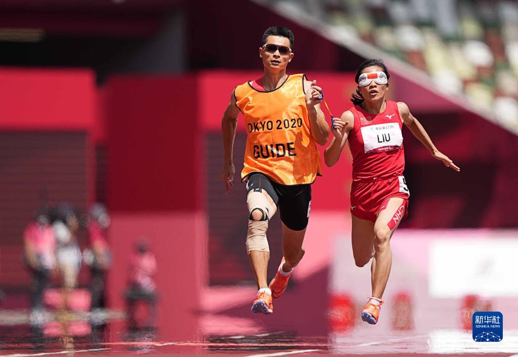 8月30日,中國選手劉翠青(右)和領(lǐng)跑員徐冬林在東京殘奧會(huì)田徑女子100米T11級第一輪預(yù)賽中。新華社記者 熊琦 攝