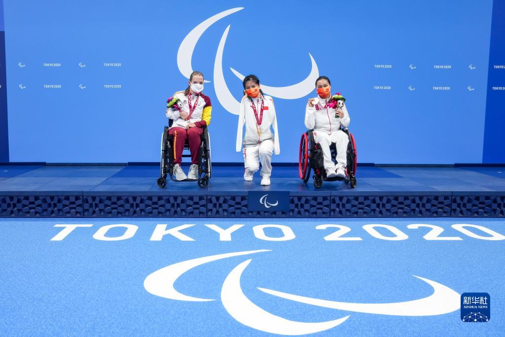 8月27日,在東京殘奧會(huì)游泳女子50米蝶泳S5級頒獎(jiǎng)儀式上,中國選手盧冬(中)單腿下蹲,與隊(duì)友成姣(右)、西班牙選手瑪爾塔·因方特處于同一高度合影。新華社記者 張鋮 攝