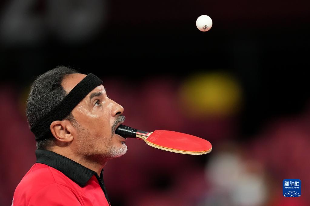 8月27日,埃及選手易卜拉欣·哈馬托在東京殘奧會(huì)乒乓球小組賽中發(fā)球。新華社記者 張鋮 攝