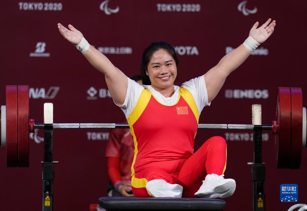 8月28日,中國選手譚玉嬌在東京殘奧會(huì)舉重女子67公斤級決賽中慶祝。新華社記者 胡虎虎 攝