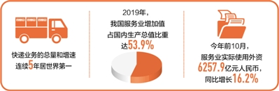 “十三五”以來,我國服務業(yè)比重進一步提高,生產(chǎn)性服務業(yè)加速邁向?qū)I(yè)化,生活性服務業(yè)不斷向高品質(zhì)延伸,優(yōu)質(zhì)高效的服務業(yè)助推產(chǎn)業(yè)改造升級,提升百姓生活品質(zhì)。2019年,我國服務業(yè)增加值占國內(nèi)生產(chǎn)總值比重達53.9%,比2015年提高3.4個百分點,成為推動經(jīng)濟增長的主動力。