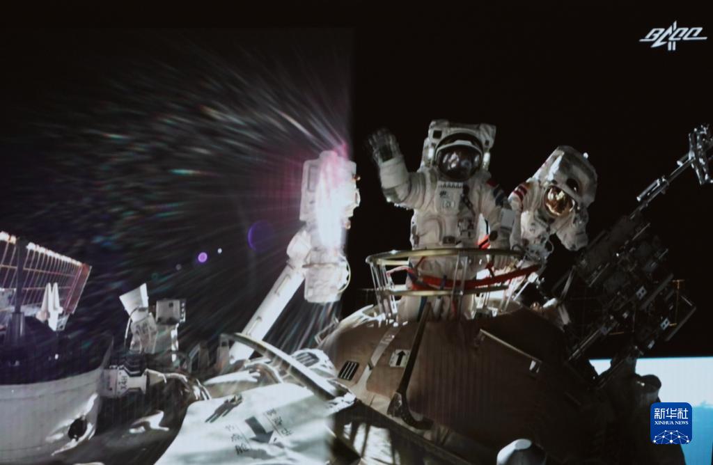 8月20日在北京航天飛行控制中心大屏拍攝的神舟十二號乘組航天員聶海勝、劉伯明在出艙任務結束后揮手示意。新華社記者 田定宇 攝
