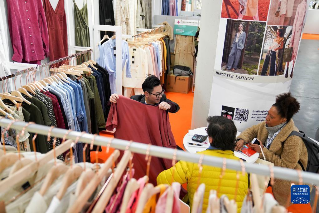 2020年1月21日,在美國紐約舉行的第二十一屆中國紡織品服裝貿(mào)易展覽會(紐約)春季展上,江蘇一家企業(yè)的工作人員(左)為訪客介紹產(chǎn)品。新華社記者 王迎 攝