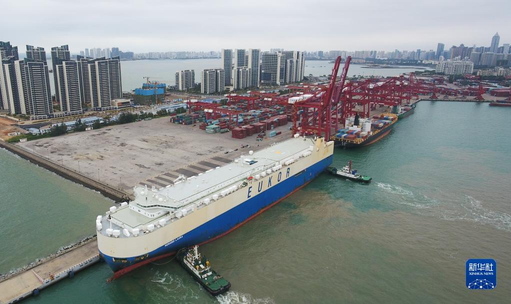 2020年2月16日,滾裝貨船“勞拉”輪駛?cè)牒?谛阌⒏郏o人機(jī)照片)。這是海南自貿(mào)區(qū)政策實施后的首艘汽車外貿(mào)船。新華社記者 楊冠宇 攝