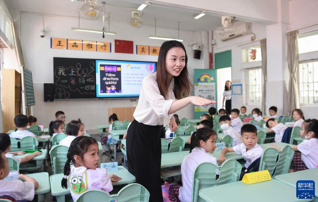 深圳市福田區(qū)南園小學(xué)教師、香港理工大學(xué)對外漢語教育專業(yè)碩士畢業(yè)的香港青年黃曉蕾在英語課上與孩子們互動(9月1日攝)。新華社記者 毛思倩 攝