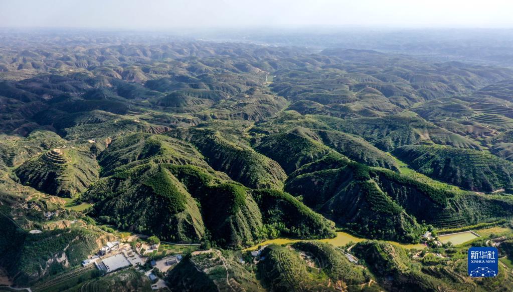 黃土溝壑中的陜西榆林市米脂縣銀州街道高西溝村滿眼綠色(9月10日攝,無人機(jī)照片)。新華社記者 陶明 攝