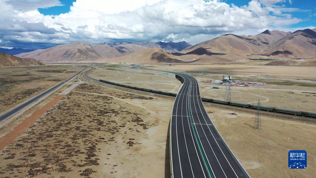 在京藏高速那曲至羊八井段,火車經(jīng)過跨青藏鐵路特大橋(5月30日攝,無人機(jī)照片)。新華社發(fā)(胡雪峰 攝)