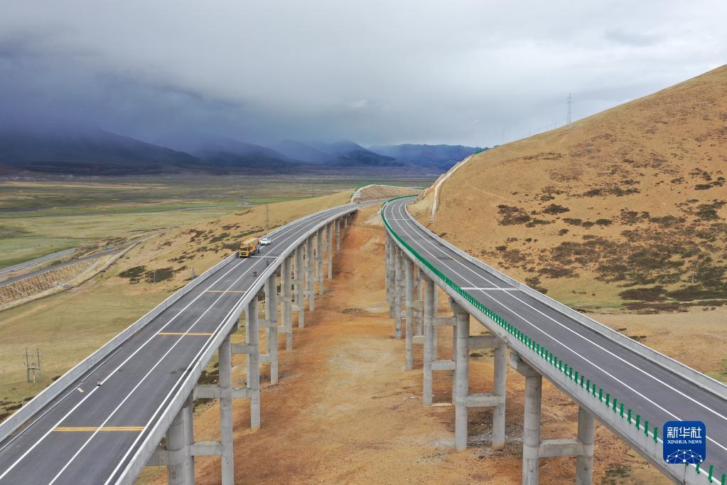 西藏拉薩市當(dāng)雄縣境內(nèi)由中鐵城投承建的京藏高速那曲至羊八井段堆巴果大橋(5月29日攝,無人機(jī)照片)。新華社發(fā)(胡雪峰 攝)