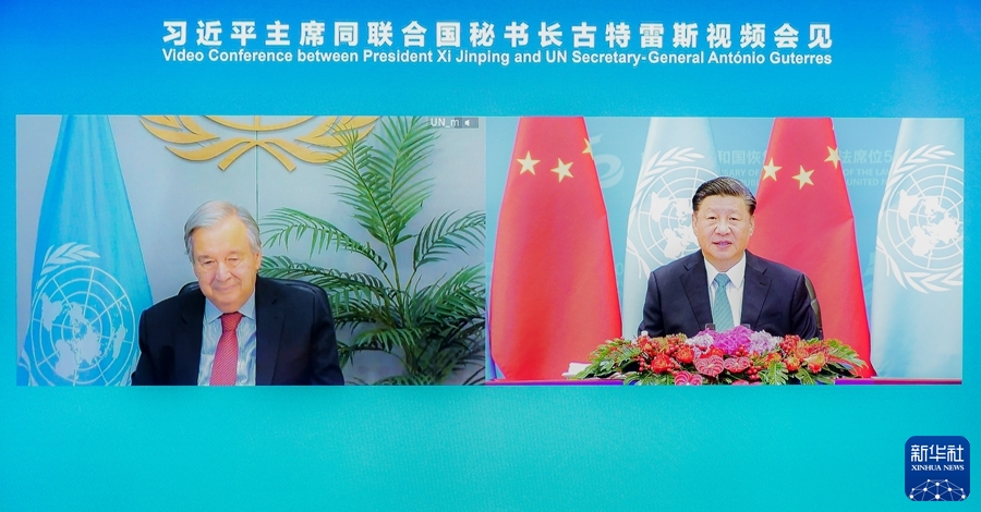 10月25日上午,國家主席習(xí)近平在北京人民大會(huì)堂以視頻方式會(huì)見聯(lián)合國秘書長古特雷斯。新華社記者 翟健嵐 攝