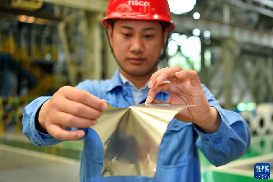 在位于山西的太鋼集團(tuán),員工展示用手撕開0.02毫米厚的超薄帶狀不銹鋼(2019年5月24日攝)。新華社記者 曹陽(yáng) 攝