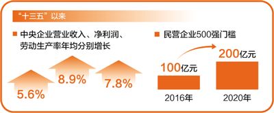 國企規(guī)模實力持續(xù)增強,效益穩(wěn)步提高。預計到今年底,中央企業(yè)資產(chǎn)總額將接近69萬億元,比“十二五”末增長45%。“十三五”以來,中央企業(yè)營業(yè)收入、凈利潤、勞動生產(chǎn)率年均分別增長5.6%、8.9%、7.8%,進入世界500強的中央企業(yè)達到48家。民企改革發(fā)展成效顯著。“十三五”以來,民營企業(yè)500強門檻從2016年的100億元提升至2020年的200億元;創(chuàng)新創(chuàng)業(yè)創(chuàng)造熱情高漲,中小企業(yè)數(shù)量增長近1倍。