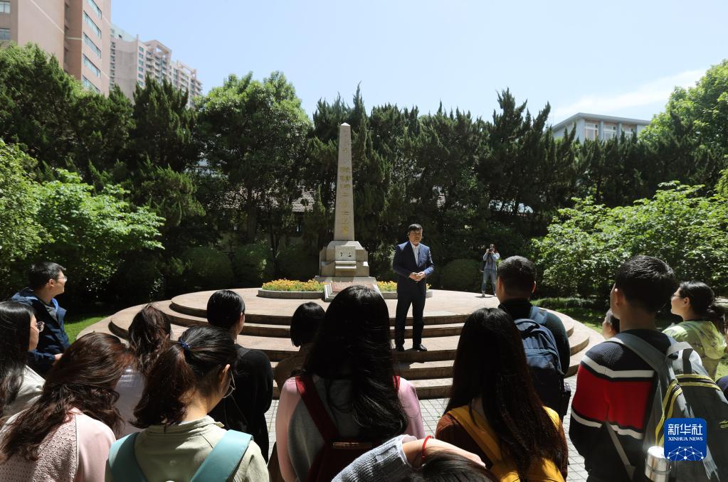 在上海交通大學(xué)校園里的史霄雯、穆漢祥烈士墓前,劉統(tǒng)教授在講述兩位烈士犧牲的歷史經(jīng)過(guò)(2019年5月7日攝)。新華社記者劉穎攝