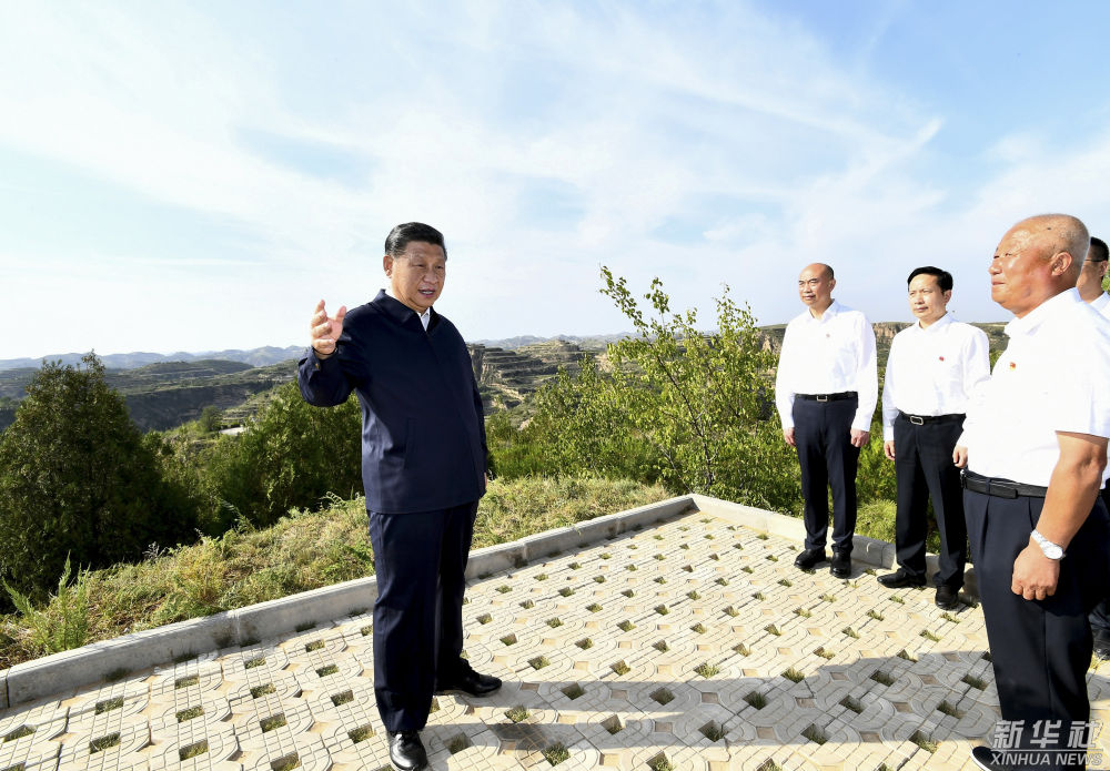 ↑2021年9月13日下午,習(xí)近平在陜西省榆林市米脂縣銀州街道高西溝村龍頭山山頂,考察黃土丘陵溝壑區(qū)綜合治理情況。