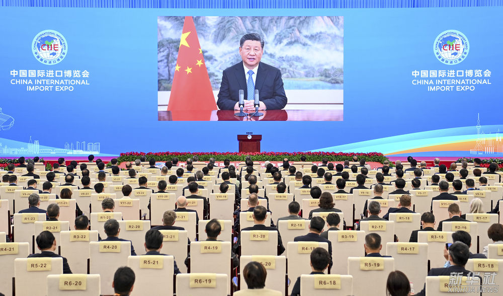 ↑2021年11月4日晚,習(xí)近平以視頻方式出席第四屆中國國際進(jìn)口博覽會開幕式并發(fā)表題為《讓開放的春風(fēng)溫暖世界》的主旨演講。