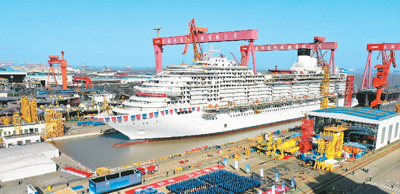日前,中國首制大型郵輪在中國船舶集團旗下上海外高橋造船有限公司船塢內(nèi)順利實現(xiàn)塢內(nèi)起浮。這是大型郵輪建造的重要節(jié)點,標志著該項目向著完工交付的總目標邁出關鍵一步。去年末,中國船舶集團總部由北京遷往上海。本報記者 沈文敏攝