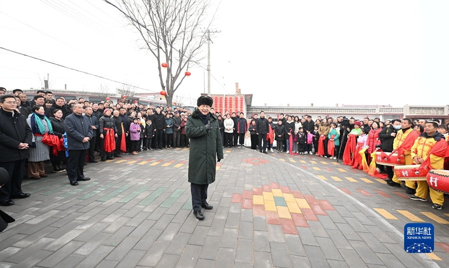 村文化廣場(chǎng)上十分熱鬧,村民們打起威風(fēng)鑼鼓、扭起秧歌歡慶佳節(jié)??吹娇倳泚砹?,人們高興地歡呼起來。習(xí)近平對(duì)鄉(xiāng)親們說,我們黨的根本宗旨就是為人民群眾辦好事,為人民群眾幸福生活拼搏、奉獻(xiàn)、服務(wù)。我們?nèi)缙诖蜈A了脫貧攻堅(jiān)戰(zhàn),如期實(shí)現(xiàn)了全面建成小康社會(huì)目標(biāo),現(xiàn)在踏上了全面建設(shè)社會(huì)主義現(xiàn)代化國(guó)家新征程。建設(shè)現(xiàn)代化國(guó)家離不開農(nóng)業(yè)農(nóng)村現(xiàn)代化,要繼續(xù)鞏固脫貧攻堅(jiān)成果,扎實(shí)推進(jìn)鄉(xiāng)村振興,讓群眾生活更上一層樓,在推進(jìn)農(nóng)業(yè)農(nóng)村現(xiàn)代化中越走越有奔頭。