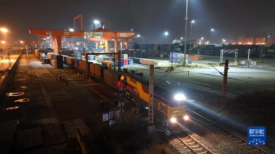 2022年1月28日,中歐班列X8086/5次列車駛出成都鐵路集裝箱中心站,這是中歐班列累計開行的第5萬列列車(無人機照片)。新華社發(fā)(白桂斌 攝)