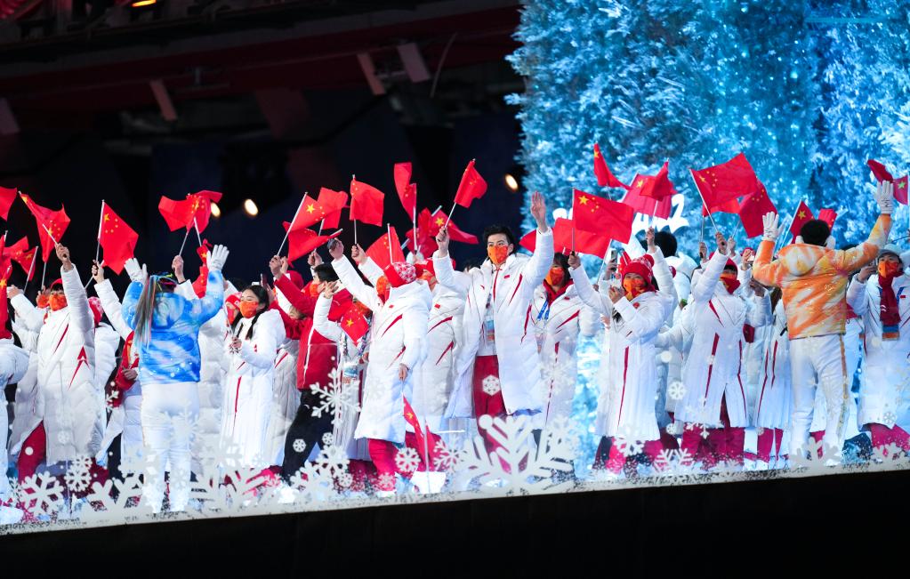 2月20日晚,中國(guó)代表團(tuán)成員在北京第二十四屆冬季奧林匹克運(yùn)動(dòng)會(huì)閉幕式中入場(chǎng)。新華社記者鞠煥宗攝