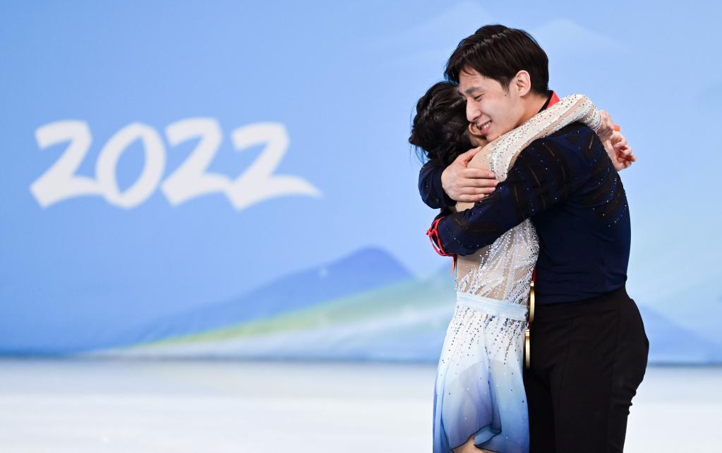 2月19日,隋文靜/韓聰(右)在獎(jiǎng)牌頒發(fā)儀式上。新華社記者李尕?cái)z