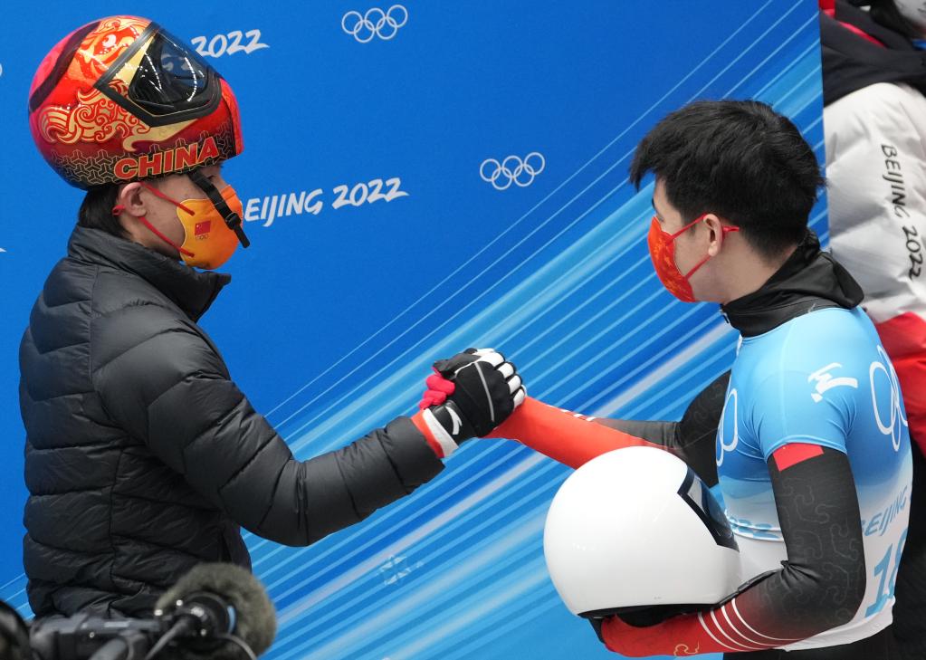 2月11日,閆文港(右)在國(guó)家雪車雪橇中心舉行的北京2022年冬奧會(huì)男子鋼架雪車比賽后和隊(duì)友殷正握手。新華社記者孫非攝