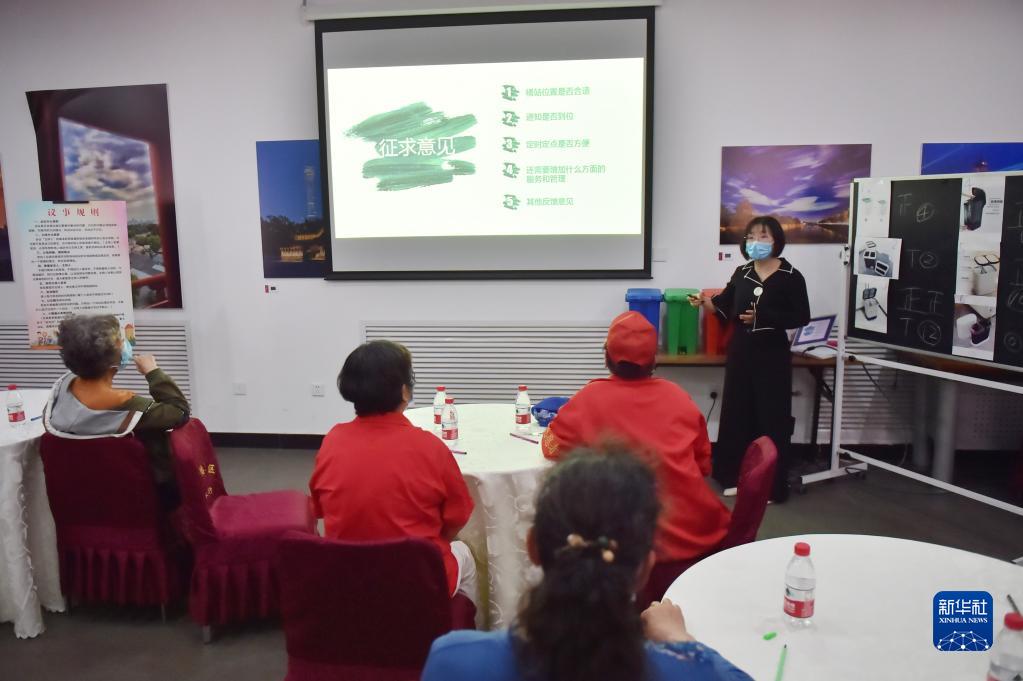 在北京建國門街道趙家樓社區(qū)議事廳舉行的“兩桶一袋”居民征求意見懇談會上,來自社區(qū)的12位垃圾分類達人對“兩桶”款式進行投票選擇,同時,街道針對桶站位置、定時定點投放等垃圾分類運營管理聽取居民意見(2020年5月2日攝)。新華社記者 彭子洋 攝