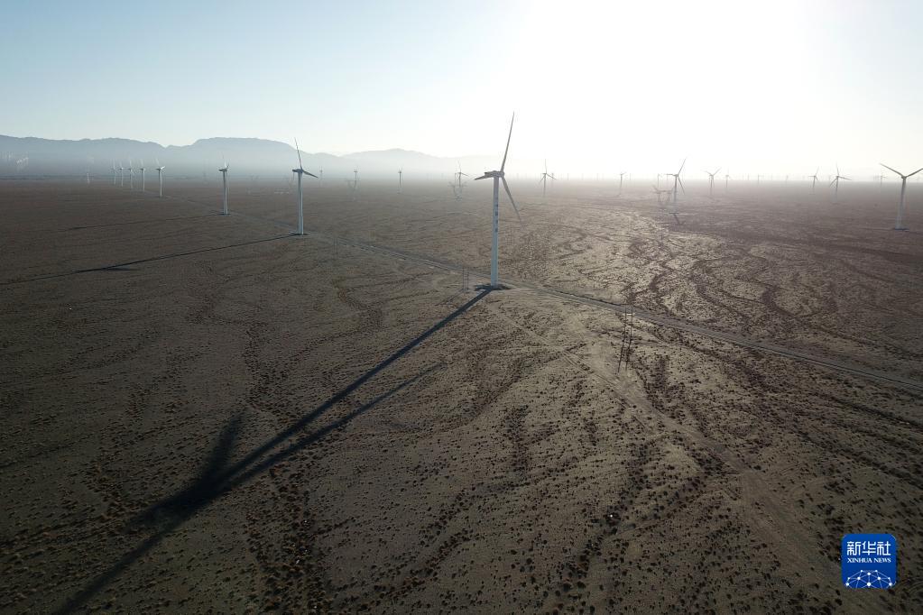 這是2021年12月8日拍攝的中節(jié)能(甘肅)風(fēng)力發(fā)電有限公司玉門昌馬風(fēng)電場(chǎng)的風(fēng)機(jī)(無人機(jī)照片)。新華社記者 范培珅 攝