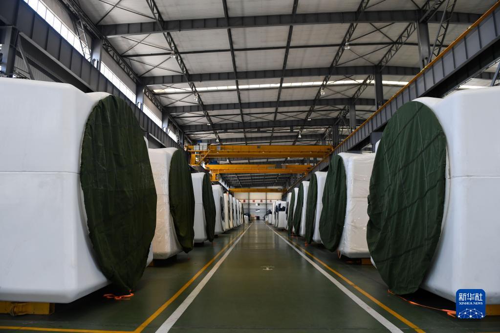 這是在內(nèi)蒙古鄂爾多斯市一家能源裝備有限公司生產(chǎn)車間拍攝的準(zhǔn)備出售的風(fēng)電機(jī)(2018年4月18日攝)。新華社記者 劉磊 攝
