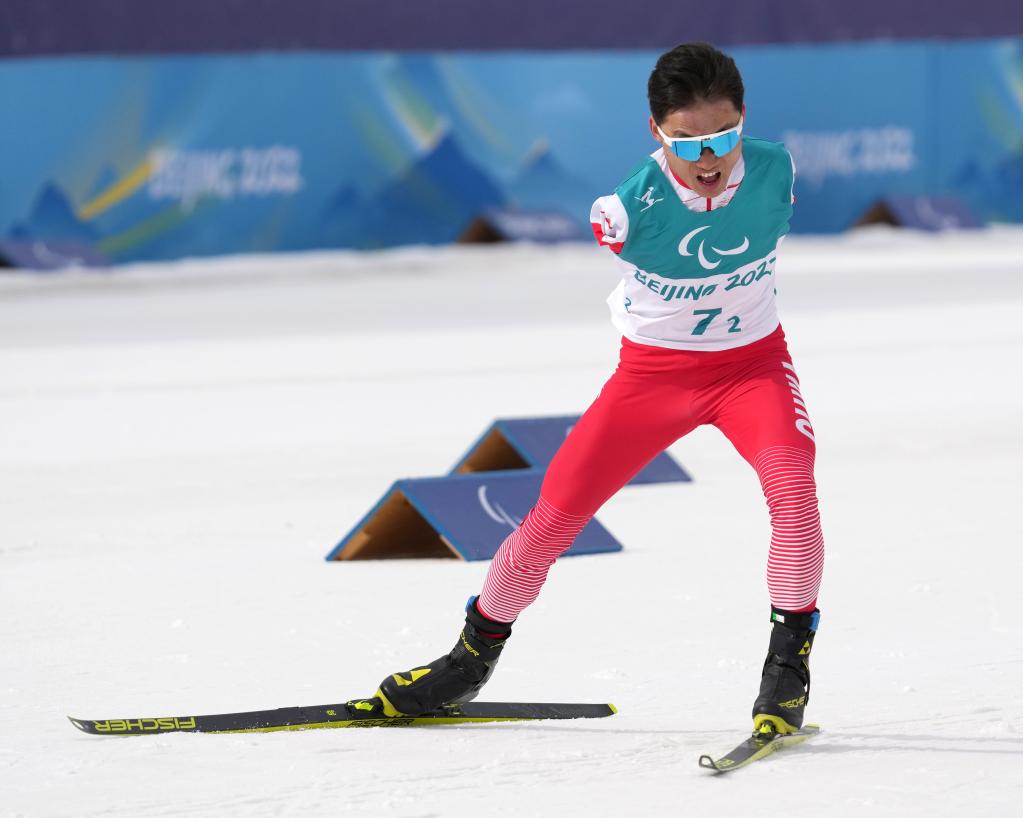 3月13日,中國隊選手王晨陽在北京冬殘奧會殘奧越野滑雪混合接力4×2.5公里比賽中。新華社記者 萬象 攝