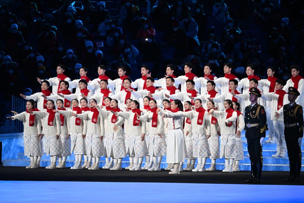 2022年3月4日晚,北京冬殘奧會開幕式上,中國殘疾人藝術(shù)團團長邰麗華帶領(lǐng)數(shù)十名殘疾人表演者用手語“唱”國歌。