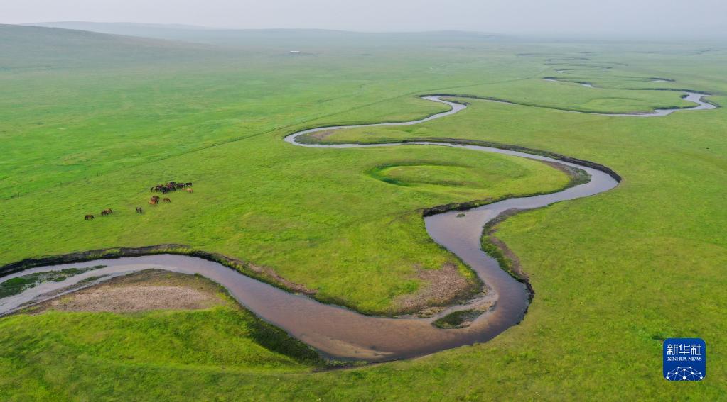這是內(nèi)蒙古錫林郭勒盟東烏珠穆沁旗乃林高勒的草原風(fēng)光(2021年7月12日攝,無人機照片)。新華社記者 連振 攝
