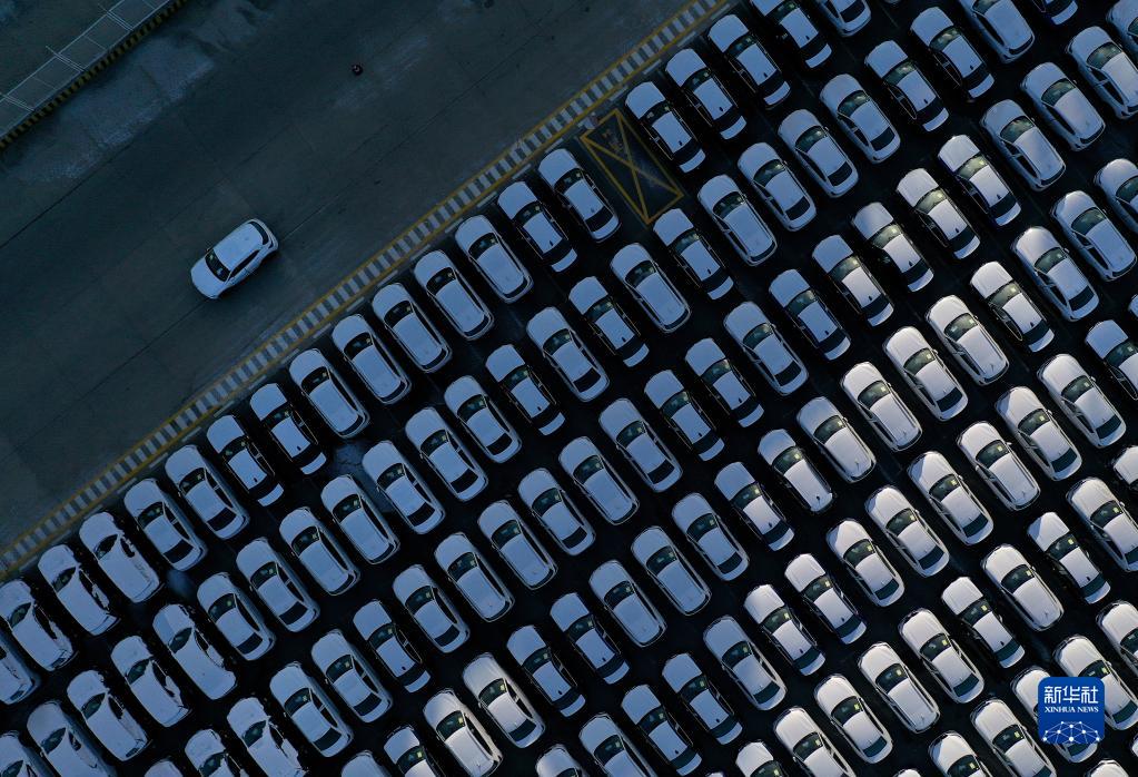 2021年1月29日,一輛運(yùn)送中的商品車行駛在大連港汽車碼頭(無人機(jī)照片)。新華社記者 姚劍鋒 攝