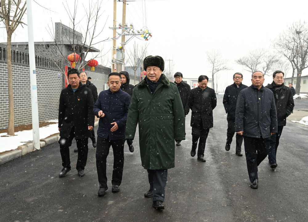 ↑2022年1月26日下午,習近平冒雪在山西省臨汾市霍州市師莊鄉(xiāng)馮南垣村考察。