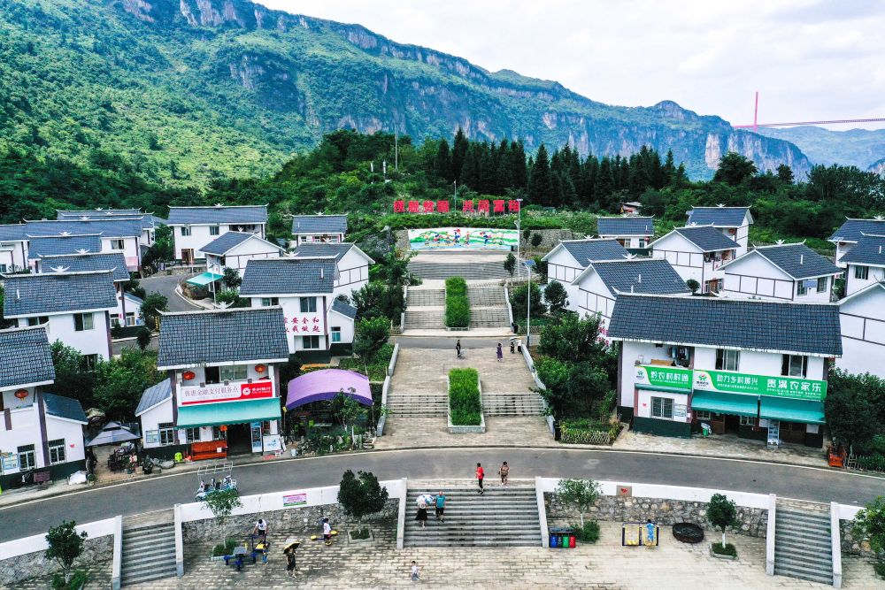 ↑2021年7月24日拍攝的貴州省黔西市新仁苗族鄉(xiāng)化屋村麻窩寨易地扶貧搬遷集中安置點一角(無人機照片)。