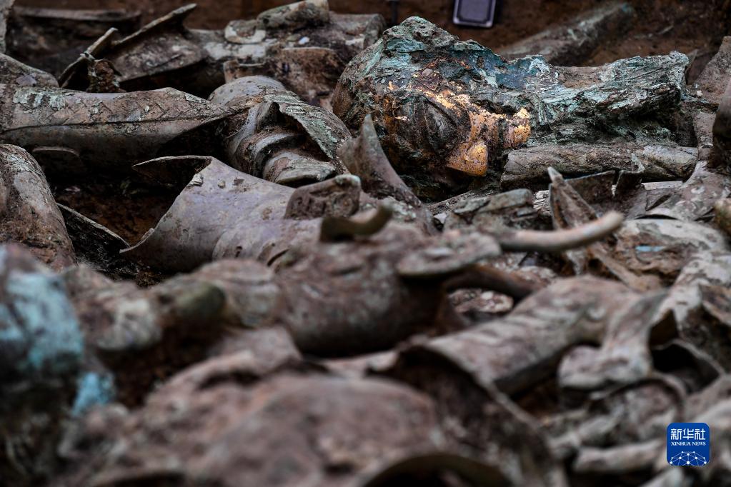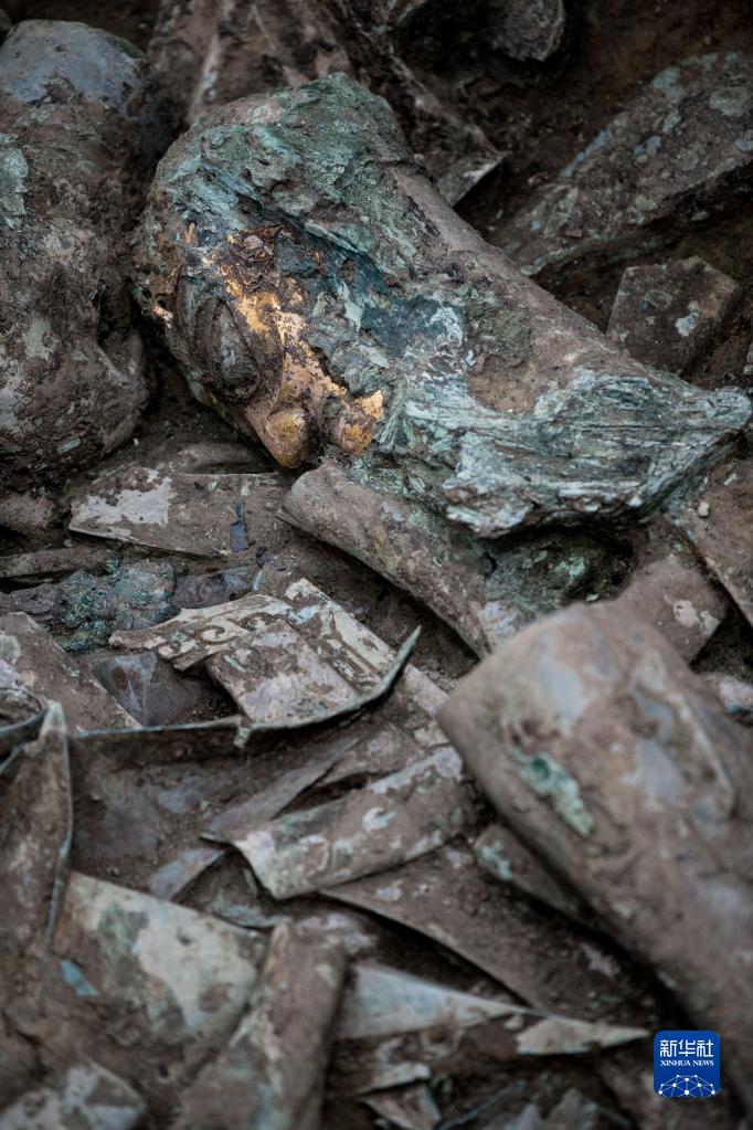 這是在三星堆遺址8號“祭祀坑”拍攝的銅神獸(6月1日攝)。新華社記者 王曦 攝