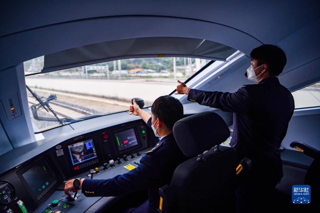 列車司機(jī)駕駛復(fù)興號列車行駛在中老鐵路上(6月1日攝)。新華社記者 江文耀 攝