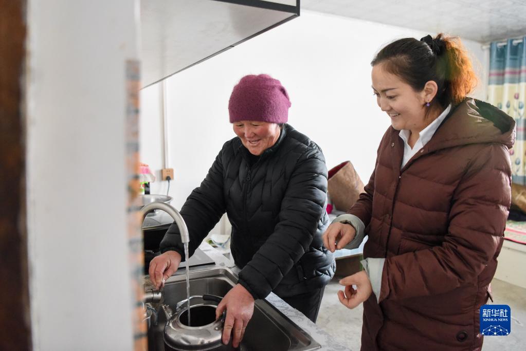 在新疆福??h解特阿熱勒鎮(zhèn)京什開薩爾村,村干部(右)來到前不久剛接通自來水的村民家中了解水質(zhì)情況(2021年11月25日攝)。新華社記者 丁磊 攝